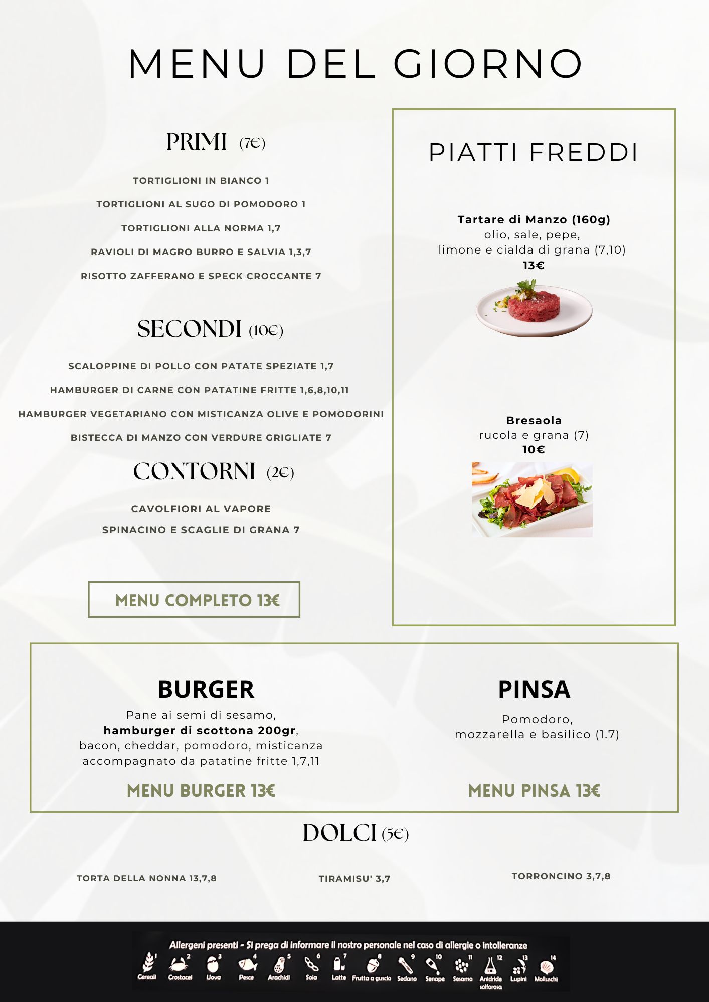 DAL LUNEDÌ AL VENERDÌ offriamo una selezione di piatti deliziosi ideali per la pausa pranzo, tra antipasti, primi e secondi piatti, preparati con ingredienti freschi e di alta qualità.